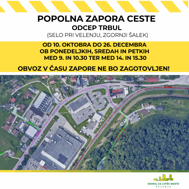 Izvajalec del na trasi hitre ceste 3. razvojne osi bo zaradi izvajanja gradbenih del, natančneje betoniranja, ponovno izvajal začasno popolno zaporo ceste na območju odcepa Trbul na območju naselja Selo pri Velenju in Zgornji Šalek.
