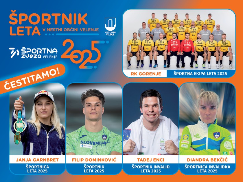 V Domu kulture Velenje smo na prireditvi Športnik leta 2025 razglasili najboljše športnike leta 2025. Naziv športnice leta 2025 v Mestni občini Velenje je prejela Janja Garnbret, športnik leta 2025 Filip Dominković, športnik invalid leta 2025 Tadej Enci, športnica invalidka leta 2025 Diandra Bekčić, za športno ekipo leta 2025 pa je bil razglašen Rokometni klub Gorenje Velenje. Na prireditvi smo podelili tudi priznanja v drugih kategorijah ter se poklonili številnim športnim delavcem in pedagogom, ki pomembno soustvarjajo razvoj športa v lokalnem okolju.