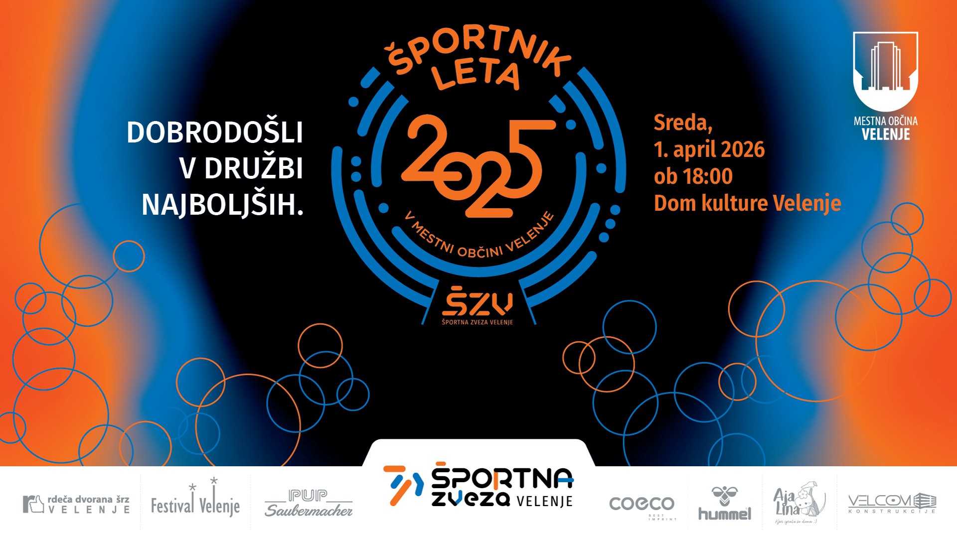 Vabimo vse ljubitelje športa, občanke in občane, da se nam pridružijo na prireditvi Športnik leta 2025, kjer bomo skupaj podoživeli poslanstvo športa in se poklonili izjemnim dosežkom velenjskih športnic in športnikov v lanskem letu ter najboljšim zaploskali. Za energijo, ritem in pravo športno vzdušje bo poskrbel The Hišn’ Band, dogajanje pa bodo s sodobnimi in atraktivnimi koreografijami popestrili plesalci plesne šole Spin.