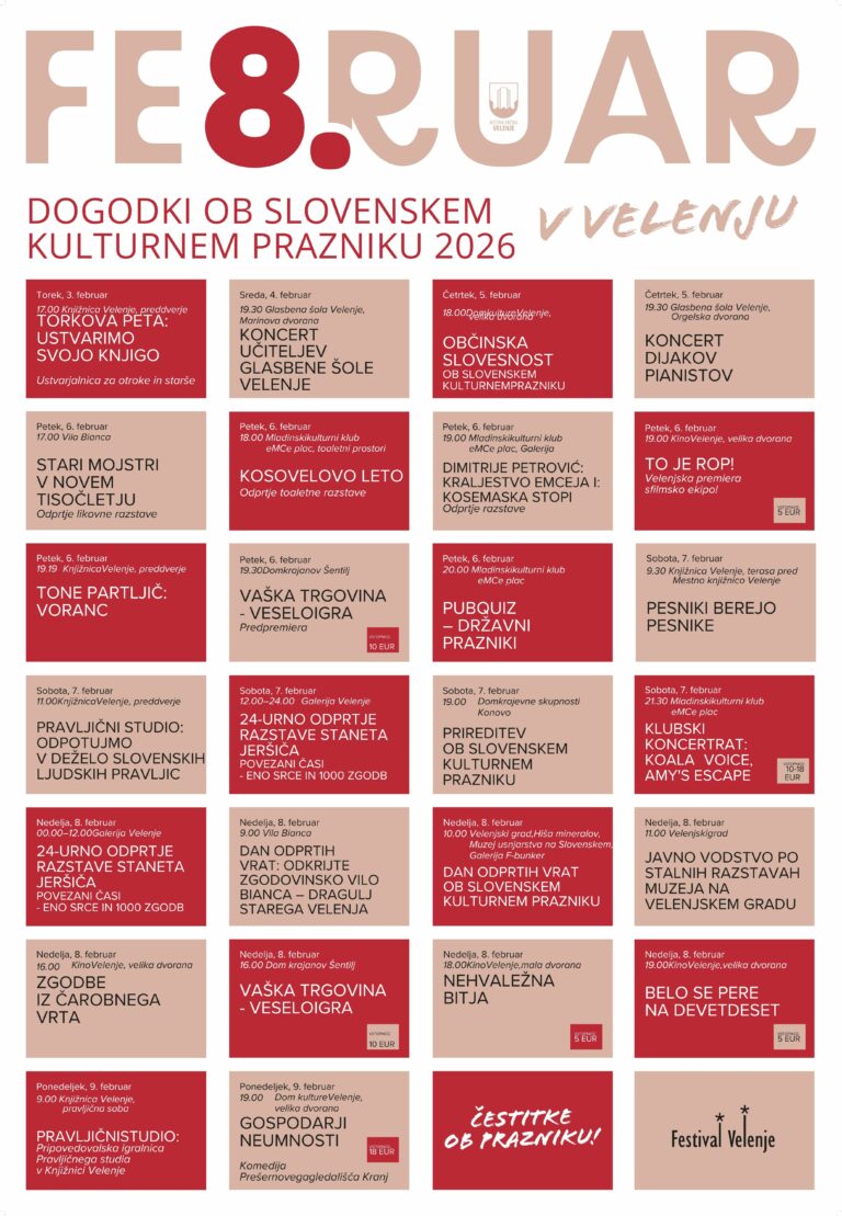 Ob slovenskem kulturnem prazniku tudi v Velenju številni organizatorji prirejajo raznolike kulturne dogodki, mnogi med njimi bodo brezplačni. Praznično dogajanje ...