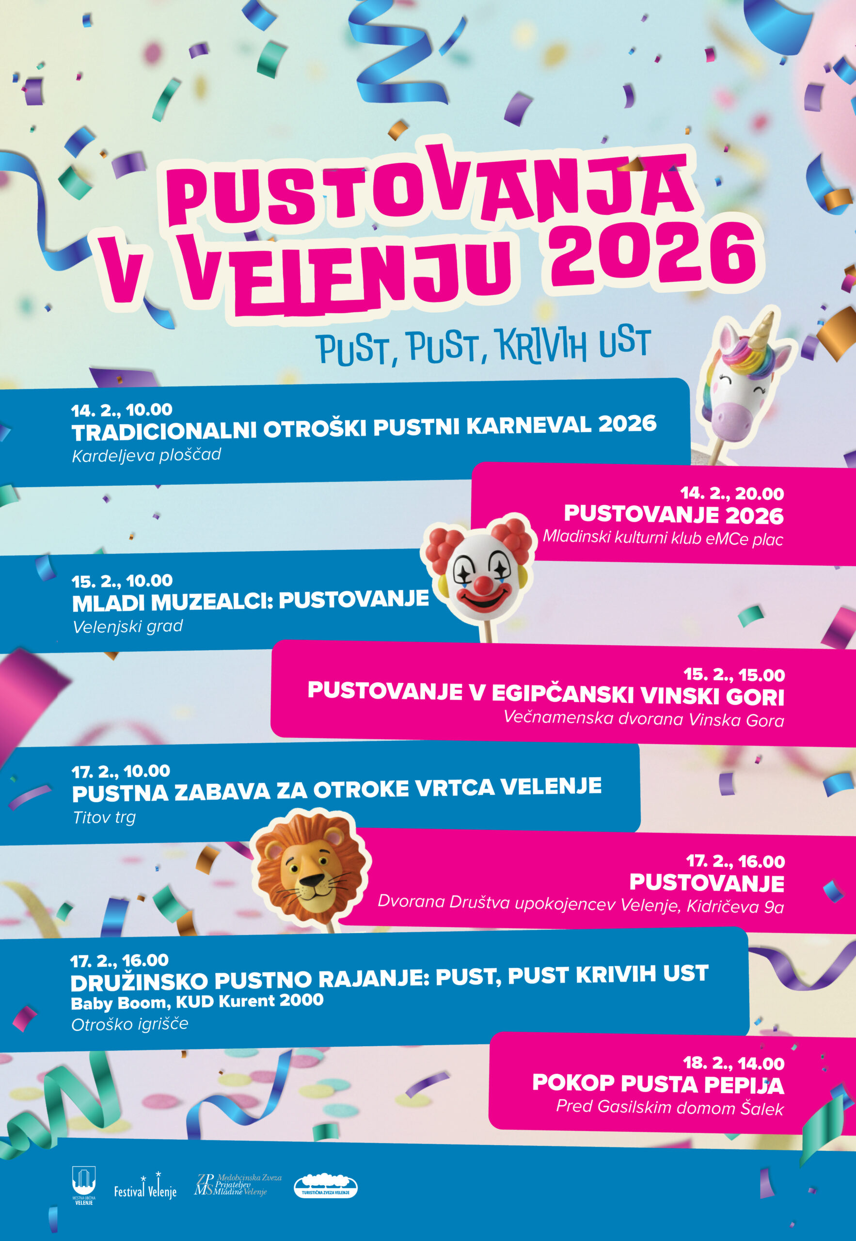 Druženje pustnih likov, obisk kurentov, pevske točke, plesne točke, igre, povorka s tolkalci, nagrade za najbolj izvirne posamezne in skupinske ...